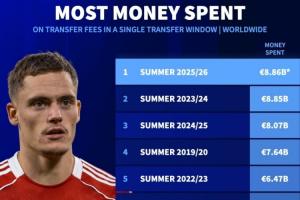 德转统计单个转会窗支出历史纪录(单位:欧元):