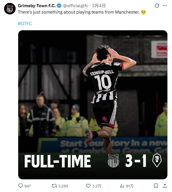 03月05日讯 昨日的英乙联赛,格林斯比3-1击败曼彻斯特球队索尔福德城,赛后格林斯比官方社媒小编不忘调侃曼联。